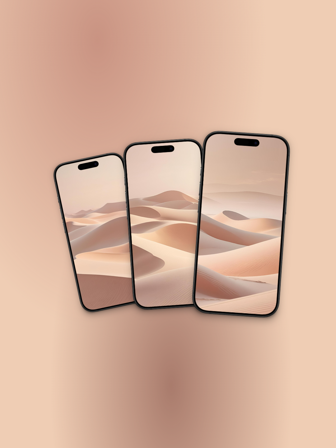 Cada uno presenta una composición minimalista de dunas de arena ondulantes en suaves tonos beige y melocotón. Con suaves degradados y una atmósfera etérea y difusa, estos fondos de pantalla en formato vertical son perfectos para crear una estética relajante y elegante en cualquier pantalla de móvil.